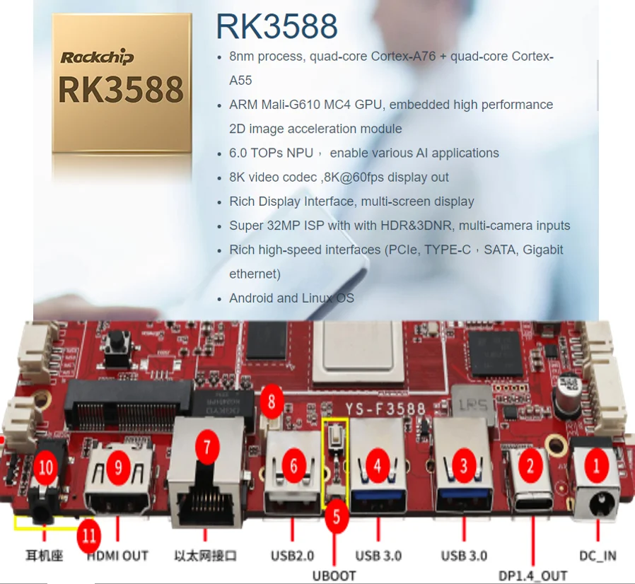 2) CPU: RK3588 8nm process, quad-core Cortex-A76 + quad-core Cortex-A55